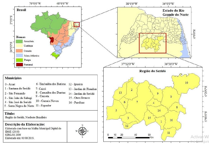 Diante disso, o principal objetivo desse trabalho é entender como a experiência com a mobilidade, o sexo e a idade podem afetar as intenções de mobilidade nas áreas urbanas do Seridó Potiguar diante das secas. O Seridó corresponde a duas microrregiões, o Seridó Ocidental e o Seridó Oriental, ambas do estado do Rio Grande do Norte e incluídas integralmente no semiárido brasileiro ( Figura 1) e no Núcleo de Desertificação do Seridó. Nelas estão inseridos 17 municípios, à saber: Acari, Caicó, Carnaúba dos Dantas, Cruzeta, Currais Novos, Equador, Ipueira, Jardim de Piranhas, Jardim do Seridó, Ouro Branco, Parelhas, Santana do Seridó, São Fernando, São João do Sabugi, São José do Seridó, Serra Negra do Norte e Timbaúba dos Batistas. Essa região está integralmente inserida na Caatinga, onde a vegetação é caracterizada por árvores com aspectos secos e retorcidos, os solos são pedregosos e os rios temporários, especialmente devido às altas temperaturas, baixas precipitação e fertilidade do solo que nela predominam. Em 2010, de acordo com o Censo Demográfico, viviam nessa região em torno dos 216 mil habitantes, que dependiam basicamente de atividades agropastoris. Por outro lado, no ano de 2010, cerca de 85% da população estava concentrada em áreas urbanas e cercadas por açudes ( Morais, 2005; IBGE, 2010; Faria, 2012; Macêdo, 2012).