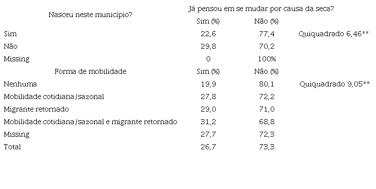 Além disso, praticar formas de mobilidade de curta distância parece mais uma condição de sobrevivência do que uma estratégia escolhida pelas famílias e indivíduos em contraste a mudança permanente para regiões não castigadas pela seca. Ainda de acordo com a Tabela 1, os indivíduos que experimentam formas de mobilidade de distâncias mais longas, como o migrante retornado (29%) e os que praticam mais de uma forma de mobilidade (ou seja, os que são migrantes retornados e efetuam a mobilidade cotidiana/sazonal, 31,2%) tendem a considerar a mudança de residência habitual por causa da seca com maior frequência que os que experimentam formas de mobilidade de curtas distâncias (a mobilidade cotidiana/sazonal, 27,8%). Essa percepção sobre a possibilidade de mudança de residência habitual pode estar associada às diferenças observadas entre o lugar de origem e destino, sendo a mobilidade extremamente relevante para moldar a percepção dos indivíduos.