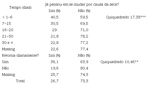 Além disso, a mobilidade pode ser onerosa, tanto em termos psicológicos quanto monetários, ao romper os laços e as redes de contato do indivíduo com o domicílio e a comunidade de origem. Por outro lado, os estudos sobre migração e desastres ambientais sempre deram mais atenção aos que se movem e o impacto para as regiões receptoras e menos para aqueles que desejam se mover, mas não tiveram oportunidades de sair das regiões afetadas. A Tabela 2, nesse sentido, mostra que os indivíduos que retornam diariamente para casa (36,1%) tendem a considerar mais a mudança por causa da seca do que os que não retornam (19,6%). Mas, os que passam mais tempo em dias fora do domicílio de residência habitual consideram menos essa alternativa de mudança permanente de residência por causa das secas. Assim, embora perfis de mobilidade puramente forçada ou voluntária seja difícil de observar na prática, cabe aqui fazer uma reflexão nessa perspectiva sobre esses resultados ( Hugo, 1996; Barbieri, 2011). Ainda assim é um pouco obscuro o caráter de voluntariedade na condição de mobilidade dos indivíduos.