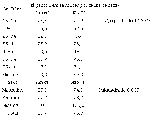 A proporção dos que já pensaram em se mudar por causa da seca é maior para mulheres (27%) do que para homens (26%), embora sem significância estatística para a diferença entre essas proporções, conforme se observa na Tabela 3. Para os grupos etário, por sua vez, há uma maior concentração dos indivíduos que já pensaram em se mudar por causa da seca nos grupos de 20-24 anos (36,5%) e de 25-34 anos (32%). O teste Qui-quadrado mostrou que a diferença entre as proporções para os grupos etários selecionados apresentou significância estatística de 5%. Nesse sentido, os mais jovens tendem a considerar a mudança de residência habitual com maior frequência que os mais velhos, de acordo com os resultados encontrados em pesquisas anteriores ( Koubi, Stoll, Spilker, 2016; Koubi et al., 2016 ).