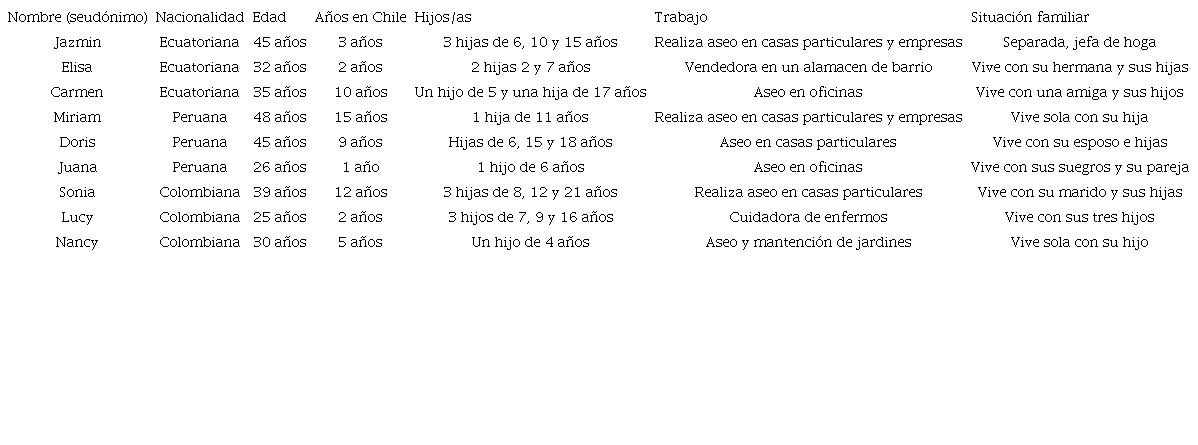 El acercamiento a las participantes se organizó de dos maneras, inicialmente por conveniencia, en que se contactó a las colaboradoras a través de establecimientos educacionales con alta tasa de matrícula de estudiantes migrantes, complementada con un muestreo tipo avalancha, gracias a la presentación que hicieron las primeras participantes. Finalmente, se trabajó con nueve mujeres, tres de cada país representado.