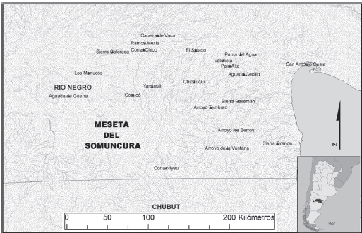 En relación a los alcances del espacio geográfico enunciado, el sudeste de Río Negro dentro de la Patagonia, trabajaremos sobre el primer tramo de la denominada línea sur, usando como eje a la localidad de Valcheta, con particular atención en los parajes2 de su zona de influencia, aunque contemplando a las localidades adyacentes como San Antonio y Sierra Grande