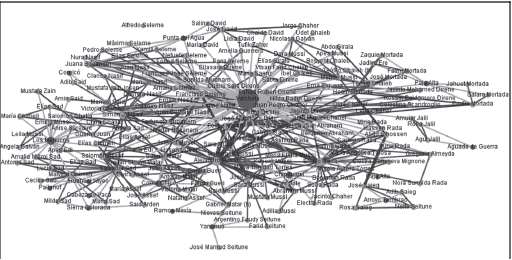 A continuación intentaremos precisar las redes de familias, negocios y territorialidad de los inmigrantes y bolicheros sirios y libaneses en el sudeste de Río Negro6. Los grafos de redes7 muestran diferentes topologías, sujetos y movilidades para el espacio social y el período analizados. El Análisis de Redes Sociales (ARS) se combina en este trabajo con la metodología de archivo y con una interpretación histórica contextual, procedimientos que tienen en común concebir como punto de partida a los documentos y a los testimonios disponibles. Como propone Reynoso: