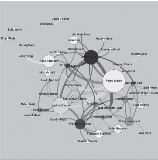 Este segundo grafo muestra solamente las relaciones de familiarización/alianza que aparecían en el anterior. El tamaño de los nodos será mayor en función de la cantidad de veces en las que esa persona actuó como testigo o como apoderado de otro, mientras que la intensidad del color crece en función de la mayor cantidad de eventos en los que un tercero ofició como testigo de la paternidad o el matrimonio de una persona. Por último, el grosor y la intensidad de color de las aristas varían en función de la cantidad de veces que se vincularon los sujetos conectados a través de este tipo de eventos, buscando mostrar aquellos casos en que la alianza es reconfirmada en sucesivas ocasiones. Vemos entonces cómo se destacan en el registro documental figuras como Felipe Marón (quien apareció como testigo en más ocasiones que ningún otro), Alejandro Mussi (quien convocó a más testigos, y asimismo, actuó como testigo en varios eventos) y otros apellidos como Chaher, Direne o Buganem. Sin inferir ningún mecanicismo a partir de ello, cabe señalar cierta tendencia a que coincidan los personajes buscados como testigos con aquellos que otras fuentes señalan como exitosos social y económicamente.