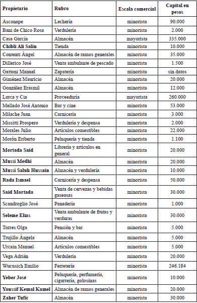 El cuadro 1 refleja la pervivencia de los comercios de sirios y de libaneses en la zona. De los treinta comercios registrados en la ciudad de Valcheta para los años 1953-1955, diez eran propiedad de sirios y de libaneses o de sus descendientes directos, es decir que mantenían el control de un tercio de la participación mercantil total.