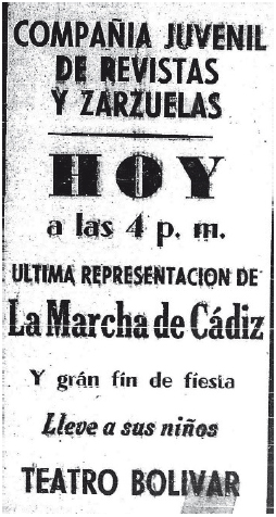 A fines de la década de 1930 el maestro Jaime Santamaría23 y Francisco Cuartas, propietario de la emisora Ecos de la Montaña, promovieron un concurso por la radiodifusora para seleccionar talentos artísticos infantiles con el fin de conformar un conjunto juvenil de revistas y zarzuelas, bajo la dirección del citado maestro24. Tras la selección, en la cual privilegiaron a pequeños entre los cuatro años y la adolescencia, el equipo se puso a la tarea de ensayar las zarzuelas más recordadas por el público medellinense, las cuales se representarían en los principales teatros de la ciudad. Un La Marcha de Cádiz, obra que nunca había sido representada por un elenco infantil autóctono. Dicha presentación se promocionó como un espectáculo familiar que prometía un fin de fiesta a cargo de los más chiquillos de la troupe. Había nacido una nueva compañía, de la que más adelante se afirmó por parte de la prensa, constituyó el primer ensayo formal del teatro colombiano.