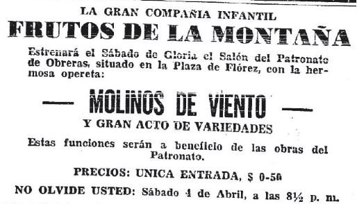 De esta manera, en los primeros años de funcionamiento de la compañía, el apoyo de las empresas privadas y de las entidades públicas, fue fundamental para darle continuidad al proyecto artístico de Santamaría. Si bien, desde principios del siglo XX, las compañías extranjeras, le solicitaban al Concejo Municipal exención de impuestos y apoyo económico, y, al Ferrocarril de Antioquia, la disminución en fletes para el personal y los equipajes28, Frutos de la Montaña por su calidad de compañía local y por estar integrada por niños, niñas y jóvenes, fue eximida por parte de Concejo del pago de impuestos en las temporadas de 194129, de 194330 y de 194531. Por su parte, la empresa privada extendió su proyecto cultural a Frutos de la Montaña, una apuesta que demostraba los gustos y la sensibilidad de una burguesía industrial con capacidad de masificar sus representaciones particulares de la sociedad. Lo que empezó con el patrocinio de programas radiales educativos en las principales radiodifusoras de la ciudad, como el “Teatro del Aire”; dirigida por Marina Ughetti y financiada por la Compañía Colombiana de Tabaco32, el “Teatro en Casa” de Fabricato33 y los conciertos Coca Cola34, se desplazó a las tablas.