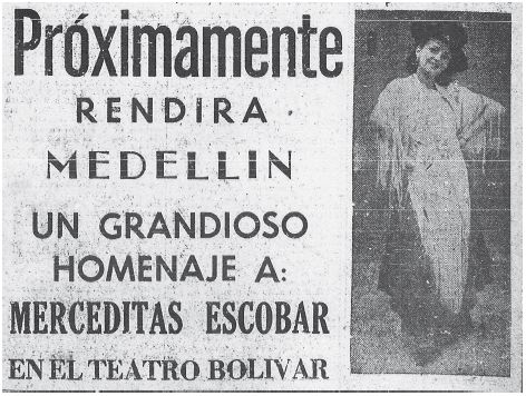 Al regreso de la primera correría, Merceditas Escobar se había destacado entre los principales elementos del conjunto, la prensa afirmaba que era “la primera estrella, con perfil tan neto y fuerte, que desde el primer instante de la representación se destaca”.44 Su carrera artística iniciaba su ascenso y ella parecía ser consciente de ello, puesto que al volver al proscenio, esta vez en el Instituto Central Femenino, interpretó lucidamente su personaje ante las estudiantes del plantel y los invitados especiales, entre los que se encontraban algunos diputados de la Asamblea Departamental y las damas pertenecientes al Cuadro de Honor de la Sociedad de Mejoras Públicas de Medellín.45 Merceditas, convertida en la preferida del público, había nacido el 13 de octubre de 1930 en el municipio de Cañasgordas (Antioquia); su padre, Jesús Escobar, oriundo de Santa Fe de Antioquia y amante del teatro, fue quien le enseñó a cantar,46 y su primera experiencia como cantante la obtuvo al lado del maestro José María Tena47 en los coros infantiles de la radiodifusora “La Voz de Antioquia que emitía un programa denominado “La Hora Infantil”48. De allí, ganadora de un concurso promocionado por la emisora, fue al Teatro Bolívar a cantar “Noche de Ronda”. Hablar en adelante de Merceditas, es referirse a la compañía escénica infantil Frutos de la Montaña, conjunto teatral en el cual consolidó su carrera artística.