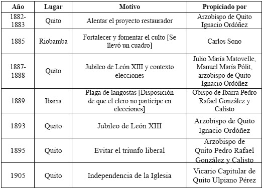 Como parte de las prácticas religiosas que el clero fomentó durante las visitas de la Virgen se encontraban procesiones,50 rosarios,51 triduos,52 misas,53 traslaciones54 para alentar a los fieles a defender la Religión y la Iglesia,55 mostrar el poder de convocatoria del clero, la fuerza de la Iglesia y la necesidad de proteger a la República.56 Esto implica que la Virgen no fue usada como una mera estrategia basada en ideas de protección como se lo hacía en la colonia o en la primera mitad del siglo XIX, sino que pasó a ser el mecanismo de movilización de las masas y de hacer público un rito, mostrando a “la Iglesia como mediadora entre los fieles y Dios”.57 Entre 1883 y 1905 hubo siete visitas en la Sierra centro-norte (Tabla 1) que permitieron al clero poner en acción la reciente mariología sobre la Virgen del Quinche.