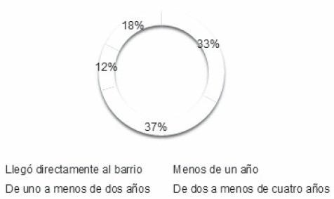 Los 50 entrevistados de la manzana de los fundadores respondieron la pregunta: cuánto tiempo tardaron en llegar al barrio Policarpa ya estando en la ciudad de Bogotá, 16 familias llegaron directamente, lo que corresponde al 33%, 19 familias tardaron menos de un año, lo que corresponde al 37%, 9 familias llegaron de uno a menos de dos años, lo que corresponde a 18% y finalmente 6 familias llegaron de dos a menos de cuatro años, lo que corresponde a 12%.