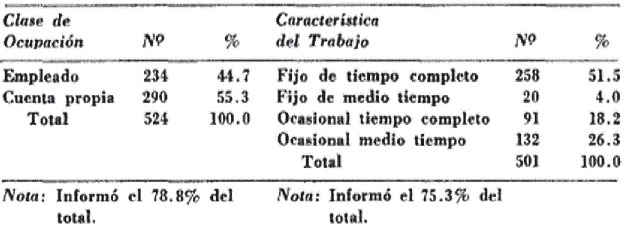 La ocupación de los jefes de familia se podía representar en dos grandes categorías: los empleados y los trabajadores por cuenta propia, donde se presentaba un amplio número de personas que trabajaban de forma independiente, lo que correspondía al 55.3% de los habitantes del barrio. Respecto a las características del trabajo, los dos grupos más grandes estaban ubicados en los que tenían un trabajo fijo de tiempo completo con 51.5% y los que tenían un trabajo ocasional de medio tiempo con 26.3%. Por otro lado, a pesar de que el 55.5% de los jefes de hogar tenían un empleo fijo, era preocupante el alto porcentaje de familias que tenían un ingreso inestable, debido a los empleos ocasionales de los jefes de familia.