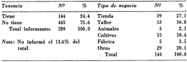 Desde el año 1961 a 1966 se habían constituido algunos negocios en el barrio, los cuales eran de diferentes tipos, entre estos estaban: tiendas, talleres, negocio de animales, cultivos, fábrica y otros. El 24.4% de la población del barrio poseía un negocio y de estas personas el 27.1% tenían una tienda, el 36.8% tenía un taller, lo que constituía las dos formas más importantes de tenencia de un negocio en el barrio Policarpa Salavarrieta en la década de los años sesenta.