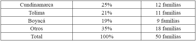 Teniendo en cuenta el lugar de procedencia de las familias que realizaron la toma de tierra en la manzana de los fundadores del barrio Policarpa Salavarrieta, podemos afirmar que 12 familias eran procedentes del departamento de Cundinamarca, 11 familias del departamento del Tolima, 9 familias del departamento de Boyacá y 18 familias eran de otros departamentos. De las entrevistas concluimos que Cundinamarca, Tolima y Boyacá fueron los tres departamentos de origen de las familias fundadoras que aportaron el 65% de personas a la toma de tierra del barrio, estas familias constituyeron la primera manzana del barrio Policarpa Salavarrieta entre 1961 y 1962.