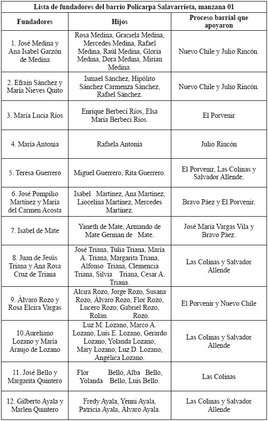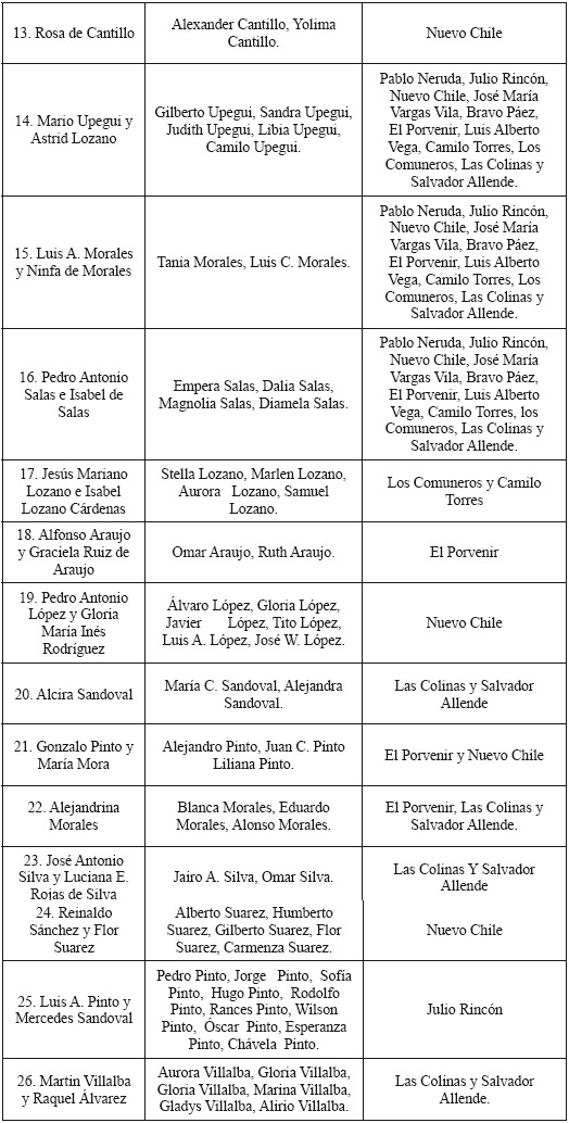Después de realizar una aproximación al movimiento social por la vivienda, es del interés de este artículo reconstruir genealógicamente parte de la historia de las familias, desde la primera generación fundadora del barrio hasta su segunda generación, lo anterior con el fin de encontrar la relación entre los nuevos barrios fundados por este movimiento social y las familias fundadoras del barrio Policarpa Salavarrieta. El resultado de este proceso de reconstrucción, fue descubrir que muchos de los hijos de los fundadores de la manzana 01 del barrio Policarpa Salavarrieta fueron líderes de otros procesos de toma de tierra en Bogotá. Por ejemplo: Empera Salas hija de Pedro Antonio Salas junto con Saúl Baquero fundaron el centro de inquilinos número diez, el cual fundo el barrio Julio Rincón en 1970.50 José Rafael Sánchez y Camilo Upegui hijos de José Efraín Sánchez y Mario Upegui, ayudaron a Vladimir Escobar y a Mario Upegui en la toma de 35 familias sin techo de unos terrenos continuos al barrio San Mateo, donde después de una ardua lucha se funda el barrio El Porvenir en 1978.51