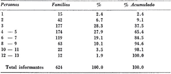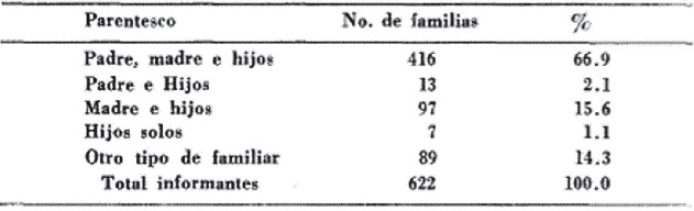 La composición familiar según el parentesco nos muestra un grado de modernización respecto a lo que se denomina familia extensa, ya que solo el 14% de las familias las componían además de padres e hijos otros familiares. También si se compara el número de familias únicamente con madre e hijos tenemos un resultado alto del 15.6% respecto a las familias compuestas por padre e hijos que tan solo eran el 2.1%.