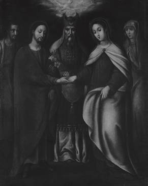 El sacerdote se convierte dentro de la pintura en el elemento legitimador de la unión, mientas que los acompañantes laterales -ubicados al lado de la virgen y san José- afirman su carácter público. Cabe señalar que el ceremonial matrimonial que se representa en la pintura es el que se celebraba dentro del rito judío,(54) razón por la cual quien aparece como protagonista es un Sumo Sacerdote del Templo, tocado con la mitra del culto hebreo. La fórmula iconográfica se basaba fundamentalmente en los grabados de Alberto Durero reproducidos luego a gran escala. El uso del grabado, indiscutible en el caso de esta escena, permitió al pintor dar forma a una sencilla imagen cuya finalidad última era la de llevar a los fieles de la Nueva Granada el mensaje de la Iglesia Tridentina.