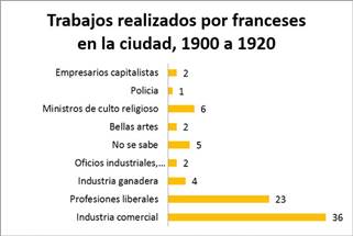 El balance demográfico realizado arrojó que los inmigrantes que tenían una mayor presencia en la ciudad fueron los franceses. Esta amplia cantidad puede ser una respuesta al crecimiento y fortalecimiento de una economía de consumo, lo que permitió que oficios como el del comercio florecieran. Lo que se vendía en estas casas comerciales o los servicios que estos franceses ofrecieron, fueron muy apreciados por la sociedad capitalina. Sobre todo, por la élite que los usaba para crear distinción y nutrir su recurrente necesidad de separación entre clases. Los franceses por medio de sus casas comerciales ayudaron indirectamente a reforzar esta idea imperante de jerarquización social, que funcionaba mediante la apropiación y el consumo de toda clase de mercancías foráneas.