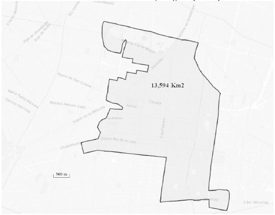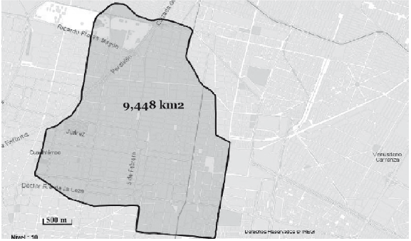 Calnek, pues, excluye de sus cifras a Nonoalco, de la que dice que no existen antecedentes históricos sobre sus barrios. Sonia Lombardo57 ofrece una superficie aproximada de 10 km2, incluyendo el islote de Nonoalco; aunque luego parece adoptar otra de 15,33 km2. Trasladando los límites de los barrios señalados por la autora a las calles de la actual ciudad, el Mapa digital de México del INEGI muestra un área de 9,868 km2 (Figura 5). Teniendo en cuenta las imperfecciones del diseño, se puede considerar una superficie aproximada de 10 km2.