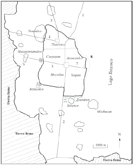 Por lo tanto, aunque las fronteras del altepetl, de hecho, estaban bien establecidas, los límites de la ciudad no estaban claramente delimitados, lo que hace que se presenten dificultades a la hora de determinar la superficie de esta. Si a ello añadimos que los españoles denominaron, en algunas ocasiones, como “cabecera” al corazón de la ciudad y como “sujetos” a estancias rurales, que según hemos dicho formaban en algunos casos parte de la ciudad, la situación se complica a la hora de hacer cálculos adecuados.