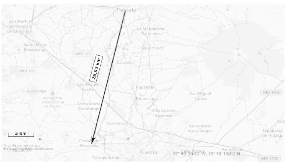 Tomando las seis leguas largas como seis más un tercio de legua, resultaría según el Conquistador una distancia de 35,27 km desde Tlaxcala a Cholula; mientras que la distancia actual, obtenida a través del Mapa digital de México del Instituto Nacional de Estadística y Geografía (Figura 2), es de unos 28,92 km.
