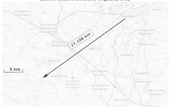 De acuerdo con el mismo criterio, las distancias de Tlaxcala al antiguo Huexotzinco, situado junto a la actual Santa María Tianguistengo, correspondientes al Conquistador y al Mapa digital del INEGI (Figura 3) serían, respectivamente, de 33,43 y 27,10 km.