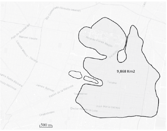 De Tolsá, pasando por Arcos de Belén y atravesando Dr. Río de la Loza llegaba a la intersección de Dr. Lavista con Dr. Andrade, desde donde continuaría bordeando las aguas hasta la Calzada de San Antonio Abad en su cruce con Avda. Chimalpopoca. En esta franja se han hallado restos de chinampas, lo que documentaría que se trataba de una zona agrícola. Una vez establecidos estos límites y superpuestos en el callejero de la actual Ciudad de México, obtenido del mapa digital del INEGI, se dibujaría la probable forma geométrica de la isla, que alcanzaría una superficie aproximada de 9,448 Km2 (Figura 8).