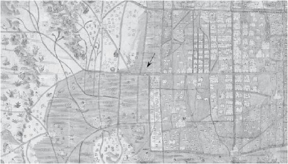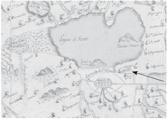 Según Alvarado Tezozomoc68 uno de los espacios donde se produjo la confrontación mexico-tepaneca en 1.428 fue en Xocochnopalyacac. Y Domingo Chimalpahin69 señala que tal centro estaba situado en las proximidades de una acequia que circulaba desde San Antonio Abad Oztocaltitlan, en Xoloco, hacia el barrio de Amanalco, ya en la parcialidad de Moyotlan. Y en el mapa de Upsala -ca. 1.550- (Figura 7), un poco más al sur de la ermita de San Antonio Abad, se observa una cruz que coincidiría con la señalada por Fray Diego Durán.