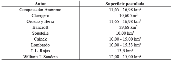 La determinación de la superficie de Mexico-Tenochtitlana la llegada de los españoles a la ciudad es tarea que ha sido abordada por numerosos investigadores, con resultado desigual. Ello fue debido, en un principio, al hecho de que los primeros conquistadores y cronistas, salvo el denominado “Conquistador Anónimo”, no dejaron cifras relativas a su extensión, aunque sí manifestaron en sus escritos la admiración que les produjo la ciudad, llegando a ponderar su tamaño como mayor al de las más grandes urbes españolas de su época.