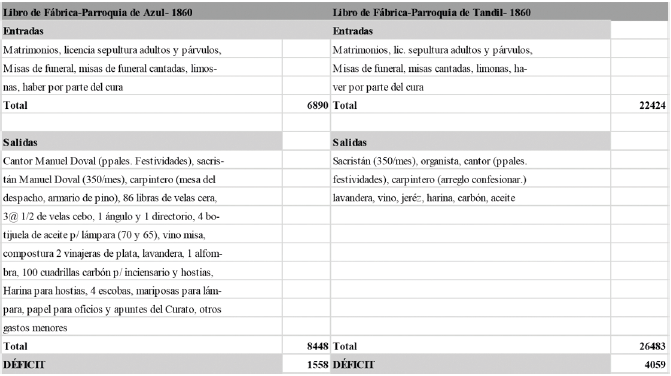 Sobre los gastos de la fábrica, estos incluyeron un amplio abanico de elementos: los productos de uso cotidiano utilizados en la liturgia, el templo o el culto (harina para fabricar hostias, vino, aceite para el sagrario, carbón para el incensario, cera para las velas o leña para calefaccionar, entre otras), así como elementos de limpieza, papel para asuntos de despacho y materiales para el arreglo de imágenes o utensilios. Sobre los gastos de 1860, señalaba el cura de la parroquia de Azul:
