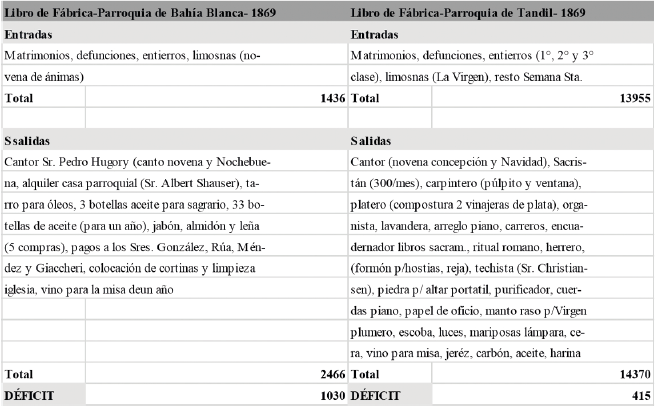 Algunas cuestiones son significativas. En los ingresos de fábrica, los ítems de las “entradas” contabilizaron el cobro de los aranceles eclesiásticos y las limosnas. En el caso de las parroquias de Azul y Tandil, alcanzaron para sostener los gastos cotidianos del culto y la pastoral o tuvieron un escaso déficit. No así en los datos del único año que contamos para analizar la parroquia de Bahía Blanca. Aquí los ingresos resultaron ser magros y el déficit muy alto. Esto quizás pueda explicarse a partir de la densidad poblacional de las comunidades en las que estuvieron insertas estas parroquias: aquellas con un número de población menor que la media (como Bahía Blanca o Carmen de Patagones), percibieron una menor cantidad de ingresos para hacer frente a los gastos fijos de valores similares que tuvieron todas (servicios, infraestructura, otros).61
