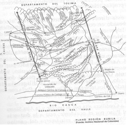 Pero si bien, durante cuarenta años no hubo mayor movimiento poblacional en la región, a partir de 1882, el incremento de colonos provenientes de Antioquia principalmente17, comenzaron a arribar al Quindío para tumbar la selva y hacer sembradíos con el objeto de adquirir la posesión de las tierras cultivadas y reclamar el derecho sobre los baldíos como lo promovía la Ley 61 de 1874. Con lo que no se contaba era que, para las mismas fechas, aparecería en la escena colonizadora el otro actor importante del Quindío, por lo menos en lo que tiene que ver con la franja oriental de la Provincia y lo que se ha denominado colonización empresarial;18 es decir, la Empresa de Fomento y Colonización Burila.