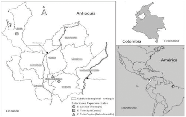 Así pues, en Medellín la experimentación agronómica comenzó antes de la llegada de la Revolución Verde. No obstante, la FR también organizó estaciones y granjas experimentales situadas estratégicamente en varias zonas climáticas de Antioquia. La estación de clima medio Tulio Ospina, situada primero en Medellín, y posteriormente en Bello, la granja experimental de clima frío La Selva en Rionegro y la estación de clima cálido Tulenapa en el Urabá (Figura 1). De especial interés para el cultivo de maíz fueron las investigaciones y labores realizadas en estas estaciones experimentales. En la estación Tulio Ospina se seleccionaron y mejoraron las primeras variedades de semillas de maíz con “características superiores” en cuanto a rendimiento, resistencia a plagas y enfermedades creadas para los agricultores del departamento de Antioquia.