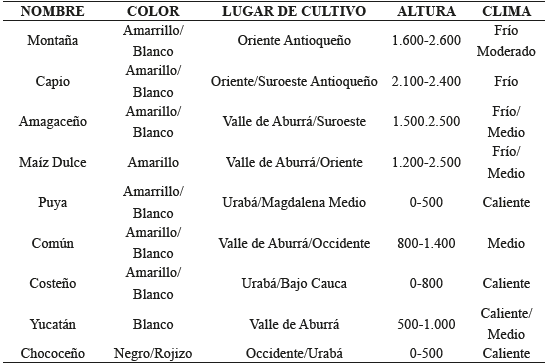 La variedad de pisos térmicos en Antioquia favoreció la adaptación de distintas razas criollas de maíz. La variedad montaña se encontraba principalmente a lo largo de la Cordillera Central de los Andes; tenía un punto de concentración en Antioquia y otro en el departamento de Nariño, en el sur de Colombia, cultivado en elevaciones con un promedio de 2.000 msnm; era empleado sobre todo por agricultores del Oriente antioqueño. El maíz amagaceño, el cual recibe su nombre por el municipio de Amagá en el Suroeste del departamento, era sembrado comúnmente en los alrededores de Medellín y otros lugares de Antioquia sobre todo en la primera parte del siglo XX.42 En el Urabá y el Bajo Cauca, situados en los límites con el departamento de Córdoba, los agricultores utilizaban generalmente semillas de raza costeña adecuadas para tierra caliente. La raza puya también era utilizada en altitudes inferiores a los 500 msnm, especialmente por los agricultores del Magdalena Medio.
