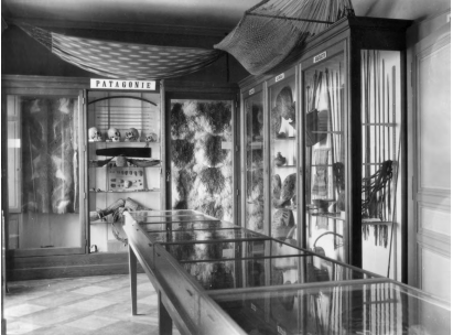 Gran parte de la sala pivotaba en torno a las colecciones procedentes de esa región geográfica, y se sustentaba -de manera particular- en los útiles prehistóricos: los muebles-vitrina emplazados en el centro de la misma presentaban puntas de flecha, raspadores y buriles, mientras que una de las vitrinas -ubicada en un lugar estratégico y flanqueada por los quillangos- mostraba los cráneos de los antiguos habitantes de este territorio (Figura 5). La mayor parte de los objetos presentados correspondían a indígenas desaparecidos o, como señalaba el propio Machon, en vías de desaparición. Esta puesta en escena contribuyó, sin duda, a trasmitir una imagen de la Patagonia marcada por la arqueologización. Finalmente, la configuración global de la sala -sustentada de manera central en las colecciones americanas de Machon, procedentes de espacios “marginales” y considerados como no contaminadospropició la construcción de una imagen cultural del Nuevo Mundo que giraba en torno al pasado, el exotismo y el primitivismo.