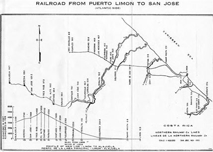 Un folleto de la Pan American Union sobre Costa Rica explica sobre el ferrocarril al “Atlántico”: “La línea principal sale de Puerto Limón, pasando por Matina, Siquirres, Turrialba y Cartago, hasta llegar a San José, la capital, a una distancia de 103 millas (166 kilómetros)”.90 En 1911, William W. Rasor escribía en una publicación norteamericana: “Es uno de los paseos más bellos que se puedan imaginar, desde la costa hasta la meseta montañosa; toda variedad de paisajes tropicales da paso a las murallas de piedra, arrastradas por rosas y moras, de Cartago y a través de las encantadoras plantaciones de café perfumado hasta el soleado lugar donde se encuentra San José a los pies de dos cadenas montañosas”.91