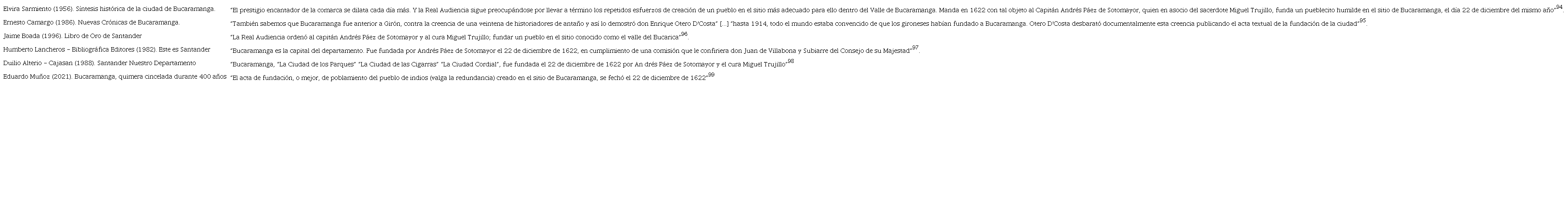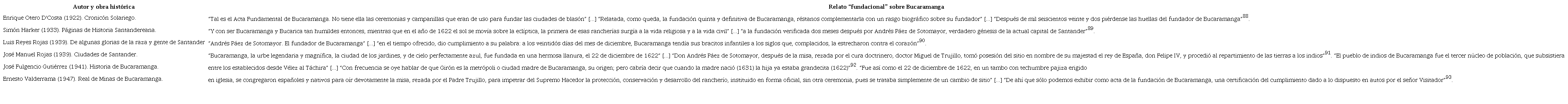 El impacto y continuidad del “hallazgo histórico” que estableció una fecha, un fundador y un contexto fundacional para Bucaramanga fue adoptada y reiterada en las principales obras históricas que fueron publicadas en los siguientes años por algunos historiadores bumangueses, en su mayoría integrantes de la Academia de Historia de Santander, la cual ha sido compilada por medio de las Tablas 1 y 2, a partir de una muestra representativa de quienes promovieron o han institucionalizado el relato fundacional de 1922 hasta 2022. Sin embargo, es de destacar que desde la divulgación del “hallazgo histórico” de Otero su representación histórica y la tergiversación hecha por los promotores del tricentenario fueron cuestionadas por autores menospreciados por Otero en sus crónicas. Ejemplo de ello fueron los versos de Enrique Lleras al expresar: “Fuese español tu origen o indiano, / cualesquiera que fuesen tus fundadores, / por tu virtud vinieron tus moradores / a agruparse en familia sobre tu llano”.87