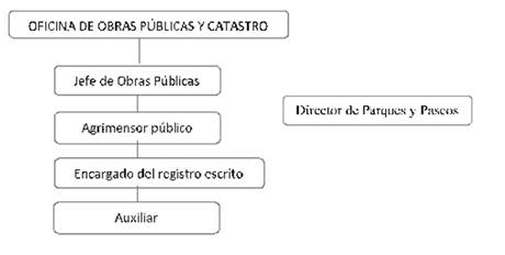 De esta forma para 1912 la Oficina de Obras Públicas y Catastro quedó conformada con un personal de cuatro empleados ubicando en primer lugar al Jefe de Obras Públicas, seguido del agrimensor, el encargado del registro escrito y el auxiliar, mientras que de forma independiente a la Oficina pero concerniente a esta se crea el cargo de Director de Parques y Paseos (figura 3):