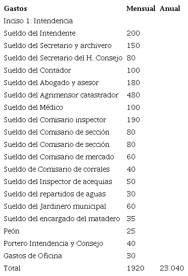 En el presupuesto calculado para 1890 el sueldo mensual para el Agrimensor/catastrador sobresale de los salarios destinados al resto del personal, incluido el sueldo del abogado y del mismo intendente (Tabla 1).