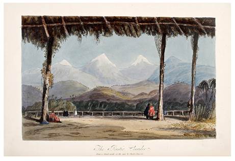 Charles Empson composed an image that could synthesize the view from one of the slopes of the Cordilleras, an image that would summarize Andean vistas for the whole of his text. This drawing represents both the individual and collective acts of contemplation seen from a specific framework that willingly tries to appear casual, in a system that organizes nature into landscape for the both onlookers in the drawings and the viewers of the image. When Empson described the site in the text, he said,