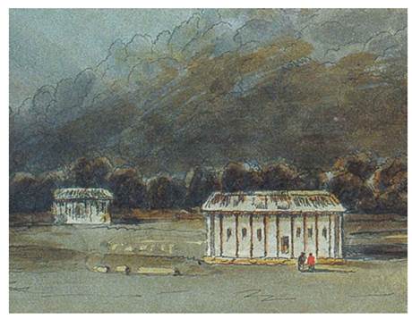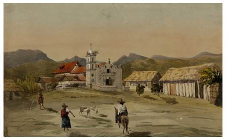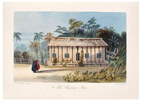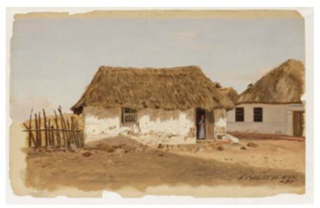 One of the difficulties proposed by the image itself is that of proportion. The author specifically mentions that this structure is the corridor of a cottage, but when the image is analyzed carefully, the size of the beholders seems evidently small in comparison with the height of the supposed cottage and in comparison, with rural cottages throughout the country in general. The height of the posts in no means seems to represent the size of what we may understand by the term cottage. The observers are very small in comparison to the spatial arrangement of this human- built element that is responsible for the act of contemplation. This structure is made compositionally interesting by the horizontal balcony that closes the square frame but leaves enough breathing space on the right hand-side of the image where it is replaced by a small, lonely palm tree. Both the vertical axis, emphasized by the three poles and the palm tree, and the horizontal support of the balcony organize the mathematical space where the organic mountains and slopes can exist as a human- built view. If we compare this framework in proportion with other examples of cottages represented by Empson (Figure 15), Henry Price (Figure 16), or Frederic Edwin Church (Figure 17), the Rustic Corridor looks fairly tall for traditional Andean constructions. If we use an average height of 1.60 meters or 5 feet 2 inches as standard human height, and we multiply this by four times, which seems to be the relation between the human and the pole in the watercolor, this would mean that the cottage has an approximate height of 6.4 meters or 20 feet, a height that could be considered unlikely considering traditional rural Colombian architecture. There is however another possible understanding of this image, and this is the probability that the three long poles are not actually supporting the hut's roof, but that they are taller trees that are actually rooted outside the rustic construction, and thus, in a middle ground.