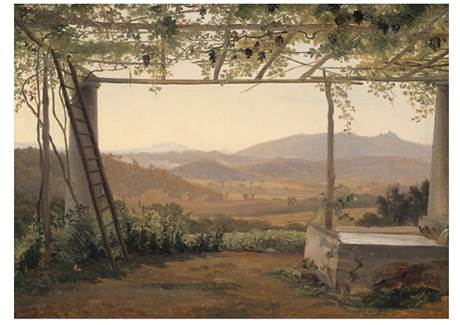 This balcony where Empson places his subjects and where he places us reminds us of this faulty vision, where what we see might not be exactly what was there, but it is enough for us to capture the meaning, the feeling and the idea of place. Curiously enough, in a manner of formal and chronological comparison, Danish artist Ernest Christian Frederick Petzholt painted around the same time his, Fountain and pergola in Italy (Figure 19), a small oil painting that transports us to the same type of intention, in an even more romanticized world. Although Petzholt does not include the human spectators as such, he means for the viewer of the painting to frame nature, lirerally, through the pergola, in order to create a specific experience of the Italian landscape.