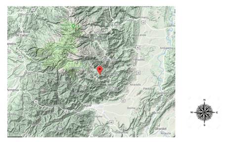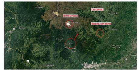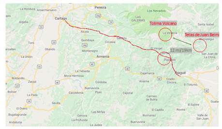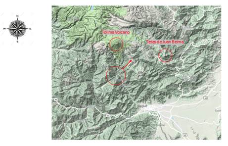 Going back to the geographical analysis of the image, if Charles Empson is standing at Las Juntas looking North-East, according to the actual physical map the approximate distance between the emblematic snow-capped volcano and the Tetas is approximately 12 miles (19 kilometers) which could make sense from Empson's vantage point. However, when we map this angle, it seems unlikely that he can actually see the three promontories as close together as he represents them in the watercolor, particularly off is the distance between mountains number one and number two from left to right (Figure 7 and ). Even if the author did see the peaks at that apparent closeness, where are the other mountains that we know would lie in between, those called Las Damas or The Ladies? Also, the elevation of these mountains on the drawing is very improbable. The volcano on the left is 17,109 ft (5,215 m) and the Tetas have an elevation of 11,568 ft (3,256 m) above sea level. This 5,000 ft. difference is not evidenced in the image, quite the contrary, the middle mountain is higher than the Volcano. Even less likely is the fact that the Tetas de Juanbeima would have had snow at this known altitude. Obviously, this license in geographical truthfulness is due first, to the fact that these published drawings were finished in England years after the trip was completed, they were based on sketches, and depended highly on the memory of the voyager. Second, that the actual function of the colored prints was always that of illustrating, as was already stated, images were, in most cases, contingent to the text.