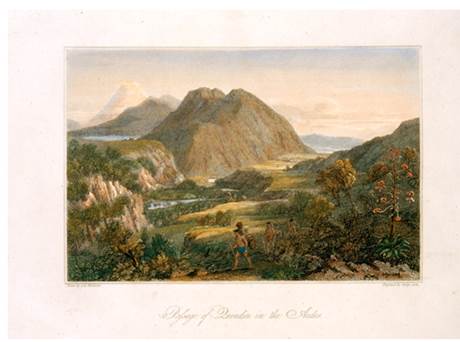 Empson titles the image, The Rustic Corridor, a name that sets the location in the context of picturesque aesthetics and gives explicit instructions in terms of attitude and pose when he involves the reader, thus evoking eighteenth-century authors such as Gilpin or Payne Knight and their detailed instructions in terms of perception and representation. The fact that the title does not specify geographical exactitude allows for this illustration to capture the imagination of both the reader and the viewer and to act as an avatar for the notion of spectacular Andean views, this place can be and is many places on the Cordillera. It is also the publishing culture of the first half of the century that still prioritized text over image, what conveys voyagers like Humboldt or Empson to find wide, encompassing visual constructions to accompany large written chapters. In Empson's case, this book carries one hand-colored print per chapter, thus allowing the one image to speak for the theme portrayed. The title of the image is the title of the chapter, or vice versa.