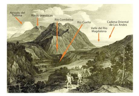 The middle range divides the waters between the Magdalena River basin and that of the Río Cauca. It often reaches the perpetual snow line, and it surpasses the latter by far in the colossal peaks of Guanacas, Barragán, and Quindiu. At sunrise and sunset, the middle range presents a magnificent spectacle to the inhabitants of Santa Fé, it recalls the view of the Swiss Alps, but on a more impressive scale”.12