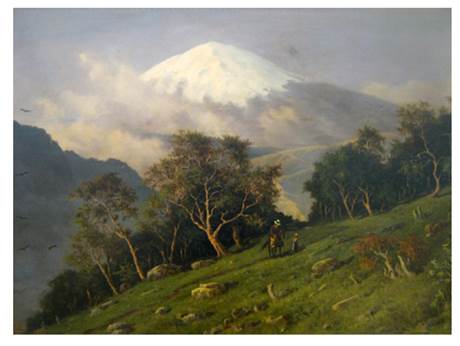 This obstacle becomes evident when contrasting The Rustic Corridor drawing with other examples of images created around the same period and geography. Observing the shape of the Tolima Volcano on various illustrations, most images, including the print already mentioned by Humboldt, intentionally confirm the obviously flattened surface of the crater. The Corographic Commission, an important geographical and regional survey sponsored by the Liberal government of Jose Hilario López in the 1850s, produced images of the same volcano by artists and travelers such as Henry Price17. Other images of the Tolima include those by German painter Albert Berg, who befriended and corresponded with Humboldt, and by Italian painter Giovanni Ferroni (Figure 9) who created a more academic, angled view. In any case, Empson's Volcano seems generalized, schematic and far away from in situ, direct observation. We can debate that a reliable, scientific image of this specific point of the Andes was not his main objective. Quite the contrary, Empson's interest in Humboldtian thought was inclined towards the musings of picturesque effects, such as those found in Views of the Cordilleras, where Humboldt explains,