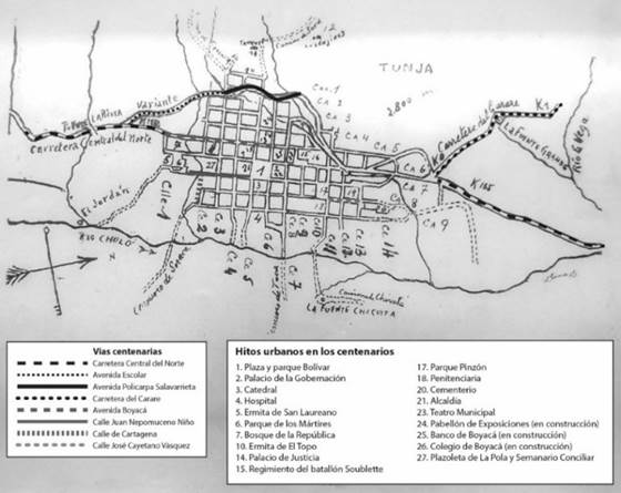 Los hitos urbanos de estas celebraciones centenarias, que se hacen en la periferia de la antigua traza de la ciudad colonial de Tunja, tuvieron como eje la Carretera Central del Norte, la primera del país en ser utilizada por automóviles y tener un servicio de transporte público para unir a Bogotá con Sogamoso y Santa Rosa de Viterbo atravesando Tunja, establecido en diciembre de 1909 por Ernesto Duperly70. Esta carretera, inaugurada con un viaje del presidente Rafael Reyes en un Renault, permitió trazar nuevas avenidas que abrirían la colonial cuadrícula urbana.