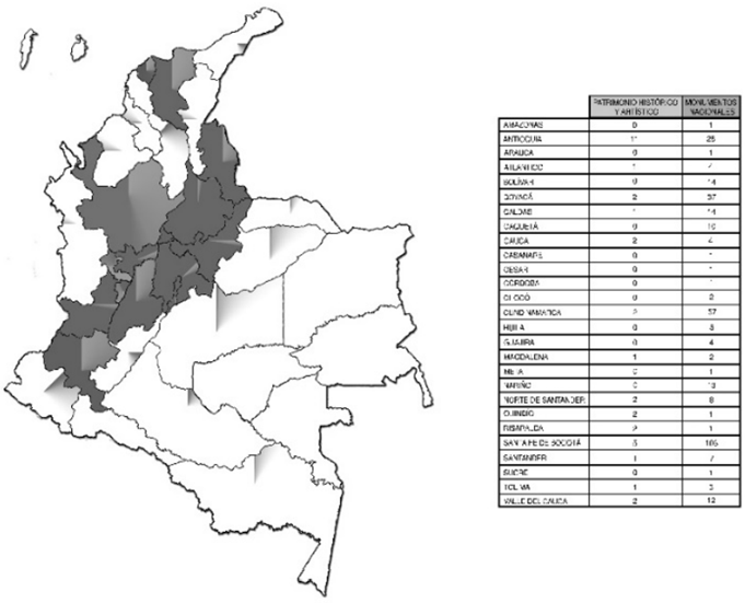 En lo que se refiere a la protección de edificaciones y bienes muebles, el CMN recibió muchas solicitudes de declaratorias de inmuebles coloniales ubicados principalmente en el interior del país, concertando favorablemente en la mayoría de los casos y dándoles la declaratoria de Monumentos Nacionales. Así, en un periodo de doce años (1978-1990) casi todo el territorio nacional contaba con inmuebles declarados, ubicándose la mayoría de los que fueron elevados a la categoría de Monumentos Nacionales en los departamentos de Antioquia (28), Boyacá (37), Cundinamarca (57) y Santa Fe de Bogotá (105). Hubo unas declaratorias más pequeñas para los inmuebles que según el Consejo de Monumentos no ingresaban en la categoría de bienes nacionales pero que merecían un mínimo grado de reconocimiento; se les catalogó como Patrimonio Histórico y Artístico de la nación41 y su mínima participación dentro de la “cartografía patrimonial”, muestra la importancia dada al pasado colonial que se reproducía en la predominancia de unos territorios sobre otros y reforzaba los imaginarios en torno al lugar ocupado por estos en el desarrollo histórico del país (Figura 1).