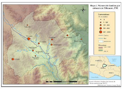 El comercio fue uno de los factores que motivó el rápido poblamiento de españoles, mestizos y mulatos en la ciudad, en las haciendas y en los pueblos de la provincia. Aunque Villaseñor y Sánchez no ofrecen una cifra concreta sobre la ciudad, sí llaman la atención sobre las «muchas familias de españoles, y gente blanca» que la habitaban. Sin embargo, en el caso de las haciendas circunvecinas, «siendo de igual consideración el número de familias de mestizos, y mulatos, y otras Naciones […]», el cálculo del autor fue de unas 300 familias22. Por lo que puede inferirse que entre el campo y la ciudad había unas 600 familias, cifra que podía corresponder a una población aproximada de 2700 habitantes. Esta cantidad, aunque considerable, no tenía comparación con la población en 1745 con la población indígena establecida en la capital de la provincia que, sin contar la treintena de pueblos y barrios que estaban sujetos a sus nueve cabeceras, ascendía al número de 9.360. En número de población la cabecera que seguía era Acatepec con 860 familias indígenas que equivalían aproximadamente a 4.310 habitantes, mientras que el número de españoles, mestizos y mulatos era de 40 familias por lo que no sobrepasaba los 180 habitantes. Estos datos corresponden solo a las cabeceras de la provincia (Véase mapa: Cabeceras de Tehuacán en 1791). Villaseñor y Sánchez no describen los barrios, pueblos y haciendas que estaban en cada una de estas jurisdicciones, por lo que la información es apenas un bosquejo general de la dinámica demográfica y económica que tenía Tehuacán en el siglo XVIII.