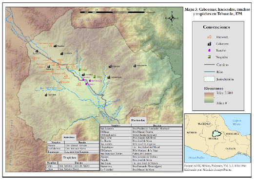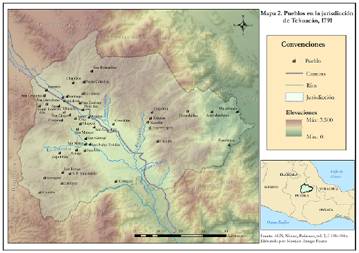 El pueblo de Tehuacán tuvo como antecedentes el convento de franciscanos establecido en el valle desde 1540, sin embargo, la congragación definitiva del pueblo como cabecera con «veinte pueblos de visita» no se llevó a cabo sino hasta la década de 156018. Entre esta década y principios del siglo XVII la población se trasladó, según Nieto, porque en Calcahualco era «propenso a fríos y calenturas como lo es hasta el presente»19. No obstante, debe tenerse en cuenta los intereses que la población tuvo a medida que ganó mercedes y privilegios. Una de ellas fue la otorgada por el virrey don Luis de Velasco en 1591, en la que «por la presente y en nombre de su majestad y sin perjuicio de su derecho ni del de otros de tercero, hago merced a la comunidad del pueblo de Tehuacán, de seis sitios de estancia para ganado mayor y diez caballerías de tierra para propios de ella en términos del dicho pueblo de un sitio junto a un vallecito […]»20. Las autoridades del pueblo debían comprometerse a introducir 2.000 cabezas de ganado menor y a cultivar las tierras. Teniendo en cuenta la extensión territorial de la merced y el mapa de la provincia de finales del siglo XVIII, algunas de estas tierras terminaron en manos de españoles.