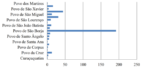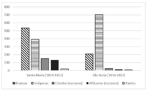 Já em São Borja, que era um povo missioneiro, os batismos de indígenas foram ampla maioria com 703 (73%) frente a 209 (22%) de brancos. A quantidade de escravos era ainda modesta com 26 (3%) crioulos e 15 (1%) africanos. Isto, sem embargo, mostra que desde os momentos iniciais da penetração luso-brasileira na região missioneira, ainda em meio a enormes turbulências bélicas e incertezas institucionais, o emprego de mão de obra escravizada se configurou como elemento constituidor da economia pastoril que estava sendo instalada em tal área.14